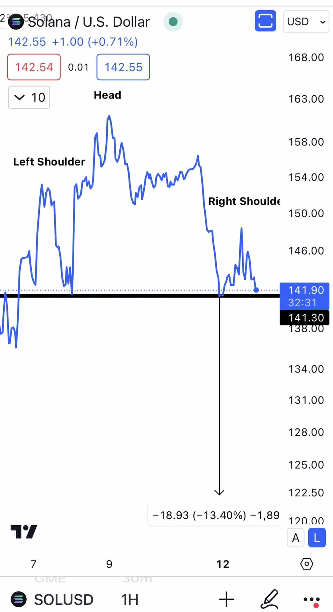 The pattern’s neckline, around $141.90, serves as a crucial level. If the price breaks below this support, it may confirm the pattern, leading to further downward pressure.