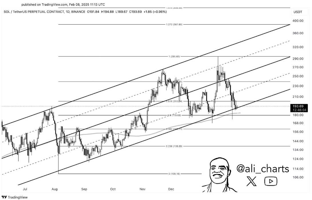 Crypto analyst Ali Martinez has highlighted a crucial moment for the price action of Solana, pointing to a key support level within a parallel channel. His technical analysis, which is based on SOL price action on the daily candlestick timeframe, shows that the altcoin has been trading in an uptrend channel since July 2024.
