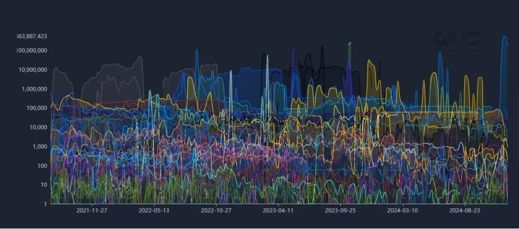 The tagged stats are displayed in real time and various projects have added their tags throughout 2024. There are now about 130 to choose from, which means the more recent data will yield more granular results. However, it’s possible to view tags for BSV’s different protocols going all the way back to the start of 2021, giving us charts that look like this: