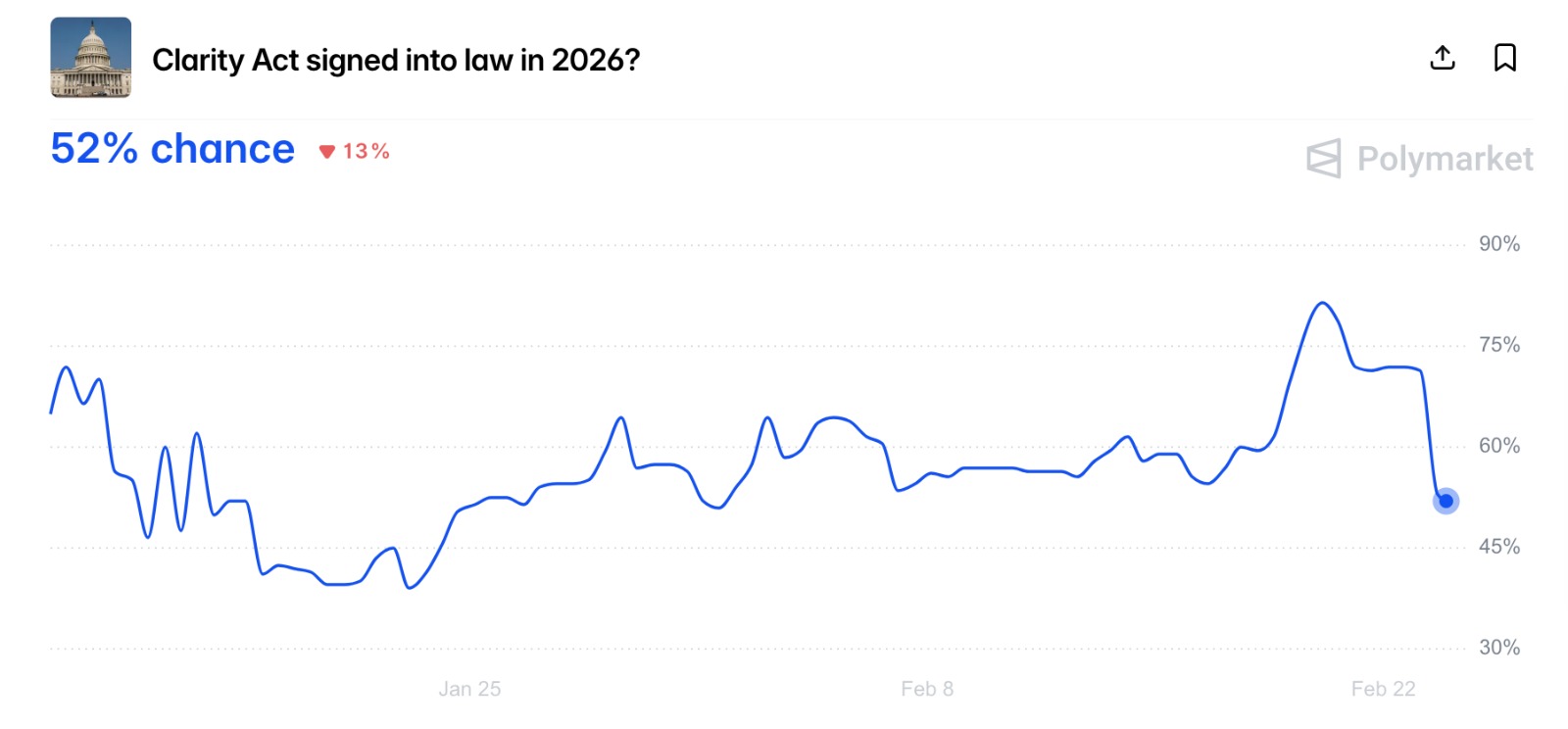 The session included representatives from Coinbase, Ripple, and Andreessen Horowitz. Last week, Coinbase Chief Legal Officer Paul Grewal said discussions around the crypto bill remained constructive and cooperative. Despite this, Polymarket odds on Clarity Act odds of passing fell to as low as 44% but have since recovered to 52% as the March 1 deadline approaches with no meaningful movement on a compromise.
