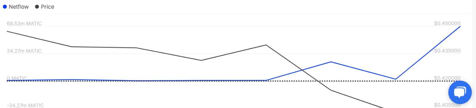 This buying pressure is largely led by Polygon whales, evidenced by the large holder’s netflow, which spiked by 3624.46% from 1.84 million to 68.53 million at press time.