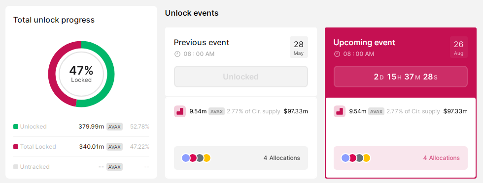 Scheduled to occur later this week, the unlock event is based on data sourced from Token Unlocks. This data indicates that an impressive 9.54 million AVAX tokens, valued at over $100 million, are set to be unlocked on August 26. Such an event has historically brought about substantial market movements, prompting analysts to closely scrutinize the upcoming developments.