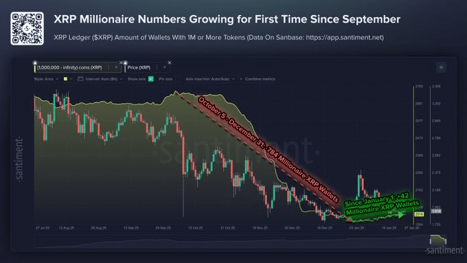 Crypto analytics firm Santiment reports that wallets holding over 1 million XRP, worth around $1.87 million, have increased for the first time since September 2025, with 42 millionaire wallets returning to the ledger. This uptick signals growing confidence among major holders.
