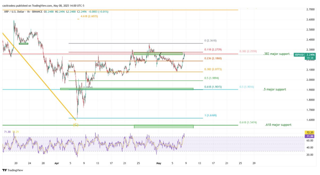 So far, XRP buyers have held the line after bouncing off $2.077, which aligns with the 0.382 retracement level. However, the relative strength index (RSI) near 72 shows that XRP is approaching overbought conditions on the hourly timeframe, which adds another layer of complexity.
