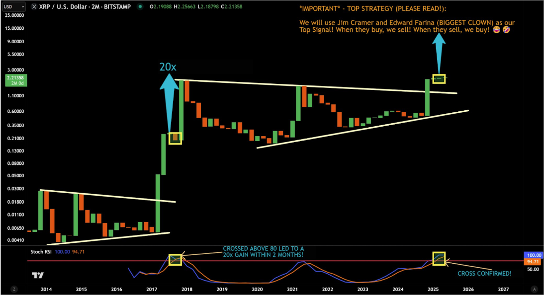 The appearance of a cross on the Stochastic RSI above the 80 level makes the current bullish setup more convincing. JD pointed out that the last time this crossover happened was in 2017, right before XRP recorded a 20x gain within three months.