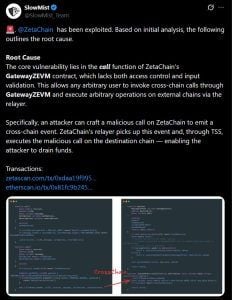 Slowmist’s findings have once again highlighted a recurring pattern in smart contract exploits where missing or insufficient access controls are applied on functions that handle sensitive operations. In Zetachain’s case, the call function in GatewayZEVM was deployable by any external address with no permission check, leaving the door open for arbitrary inputs to be processed as legitimate cross-chain instructions.
